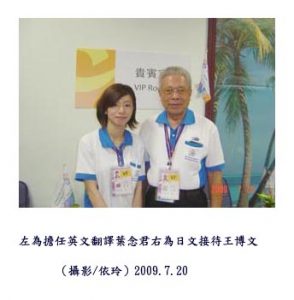場浮士德球賽,擔任VIP Room志工的兩位美少女,一位是來自文藻外文系學生張維娟,另一位是來自高醫的研究助理葉念君,還有一位擔任會長夫人的隨身接待郭旗成老師,目前也是新光國小的英文教師,其中的元老級志工王博文先生,曾經擔任華南銀行經理退休,他也擔任這次日文翻譯,這些志工都是來自各階層各行各業的精英,他們秉持著熱情全心付出投入,除了語文能力要很強之外,每一個形象都非常好,筆者走進VIP Room就感受到如天使般的笑容和親切的引導貴賓,無形中也在為我們國人做外交,堪稱『世運外交官』。