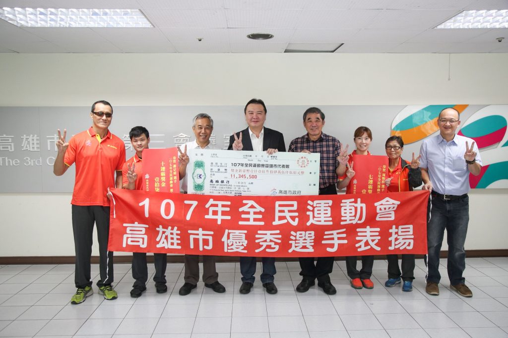 獎金由高雄市體育會朱文慶理事長及此次表現最亮眼的健力選手謝宗庭、周怡汝代表受贈。許市長表示,除給予選手及教練實質鼓勵外,也期許運動發展局、教育局及體育會能持續攜手合作,精益求精,更強化選手優質培育和照顧的資源及環境,提升高雄競技運動實力。