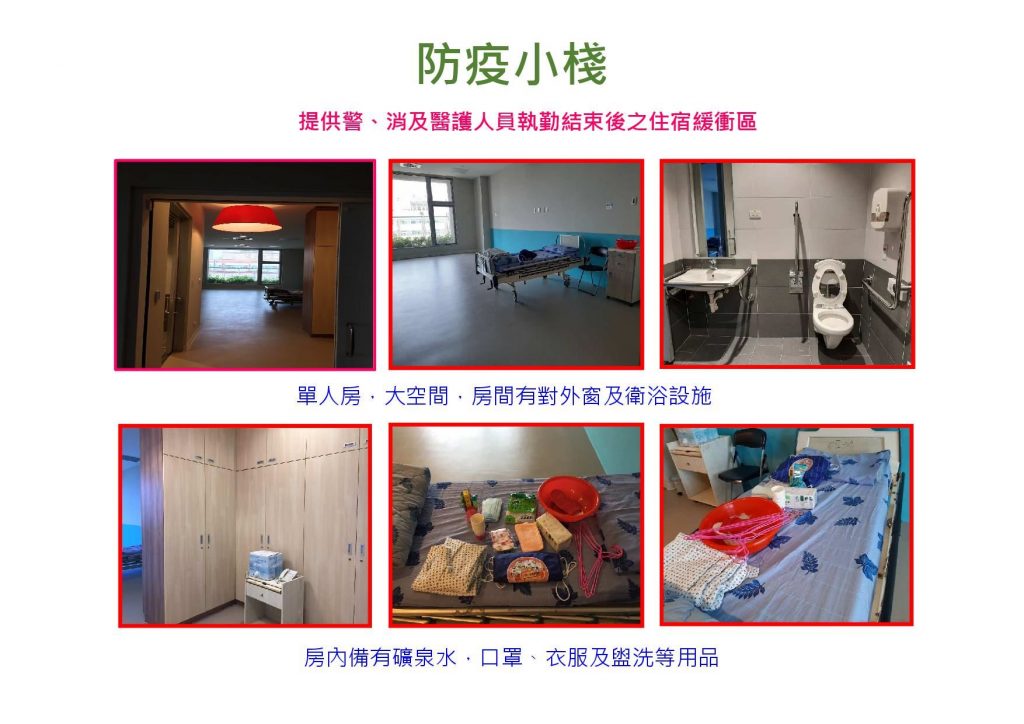 自3月16日起高雄市防疫小棧也正式上線服務,自1月底疫情發生後,本市防疫警消、醫護人員等24小時接力執勤,為此市府用愛與關懷來裝潢小棧,目前可入住63床,讓同仁在執行防疫工作後能在小棧休息充電。本項服務深獲警消醫護人員的贊同,某消防人員表示,自己很高興能為這次的疫情盡一己之力,可是因應疫情的特殊性,自己回家後擔心致使家人有感染等風險,所以感謝市府替工作人員設想周到,提供一處安全處所能休息,自己也可以更放心在工作上衝刺,相信在市民共同努力下,我們一定能共體時艱安然度過這波疫情。