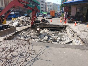 今日(10號)早上,鹽埕區大仁路與新興街口路面發生下陷,下陷面積約8.5*5.6公尺,下陷下方為5公尺寬、深1.3公尺雨水箱涵,經派員緊急搶修,所幸無人傷亡。 水利局表示,下陷原因係感潮段,鹽份易使箱涵頂板鹽化造成破損下陷,經現場開挖並辦理整體箱涵重建,初步估算所需經費為50萬元,預定2週內緊急完成修復,恢復道路通行。