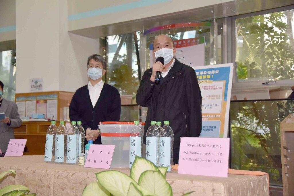 因應嚴重特殊傳染性肺炎傳播風險,高雄市長韓國瑜今(31)日下午至財稅行政大樓進行防疫宣導,示範正確泡製500PPM漂白水及環境消毒擦拭方法,提醒市民朋友做好居家環境消毒工作,他表示,針對居家以及辦公場域常接觸物品表面,如桌面、門把、電源開關、電話等應加強擦拭消毒,呼籲民眾勤洗手、戴口罩、減少不必要的大型聚會,以遏止疫情傳播。
