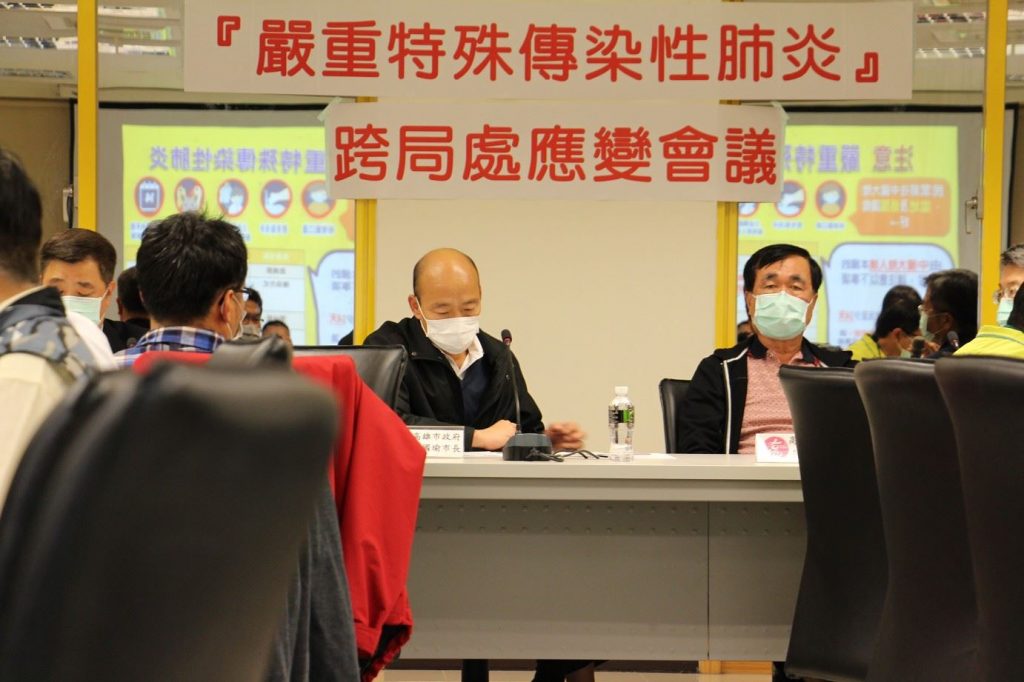 韓國瑜表示,今天晚上防疫指揮中心已提升為一級開設,由他本人擔任指揮官,全力來指揮調度各局處的防疫工作,並要求重建台商這兩天的路線及接觸史,包含捷運、社區或舞廳的接觸人員,而物資部分,包含口罩,緊急收置等工作,各局處都已積極整備。他也呼籲民眾,應保持良好衛生習慣,面對疫情不必過度驚恐,市府相關部門會全力來守護市民健康,請各位市民朋友安心過年。