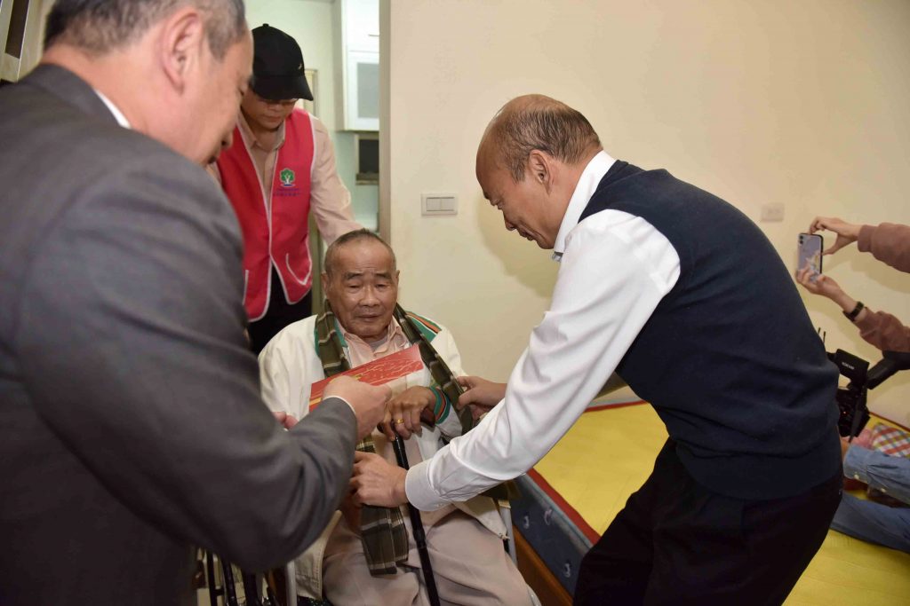 韓國瑜親贈市長紅包、圍巾、年菜禮盒,並為長輩繫上圍巾,擁抱並牽起長輩的手,預祝新年快樂,獻上溫暖及祝福,並提醒有任何問題皆可洽詢社會局社工或當地民意代表,市府定會盡全力協助幫忙。甄珍女士隨市長之後,亦贈上紅包及福袋,內含生活用品、衣物及年節禮品,並祝長輩們身體健康、早日康復,在滿滿的社會暖意下過好年。