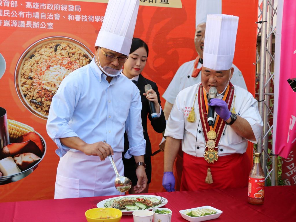 高雄國民公有市場開市迄今50餘年,各類蔬果、肉品、水產、熟菜,從庶民價格到高檔食材一應俱全,客群涵蓋普羅大眾,每逢年節更是擠滿採購民眾,成為高雄另類年節風景。今日上午由阿華師帶領民眾採購年菜,並現場教授烹飪秘訣,六道飯店級料理只花費1688元,副市長葉匡時也戴上廚師帽一起準備年菜,祝福大家開心過好年。