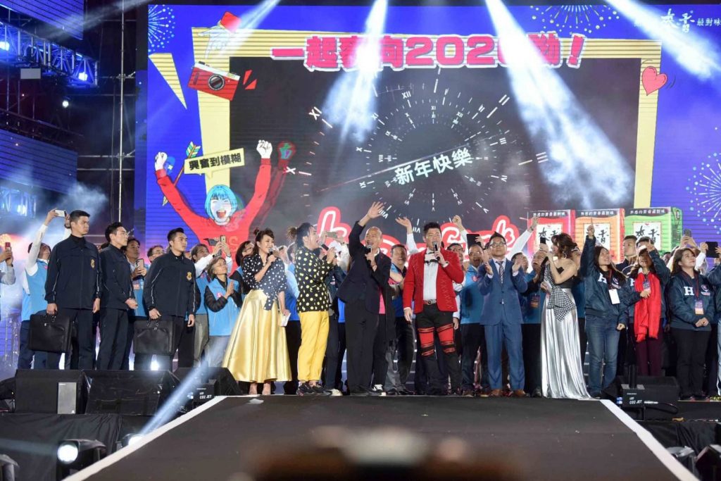 揮別2019年迎向嶄新時刻,全台指標性跨年盛會「愛‧Sharing2020高雄夢時代跨年派對」今(31)日晚間於高雄時代大道熱鬧登場,高雄市長韓國瑜攜手市府團隊等來賓熱情參與,登台倒數後,台上台下高呼「新年快樂」彼此互道祝福,歡喜迎接新年到來,現場洋溢歡樂幸福的氛圍。