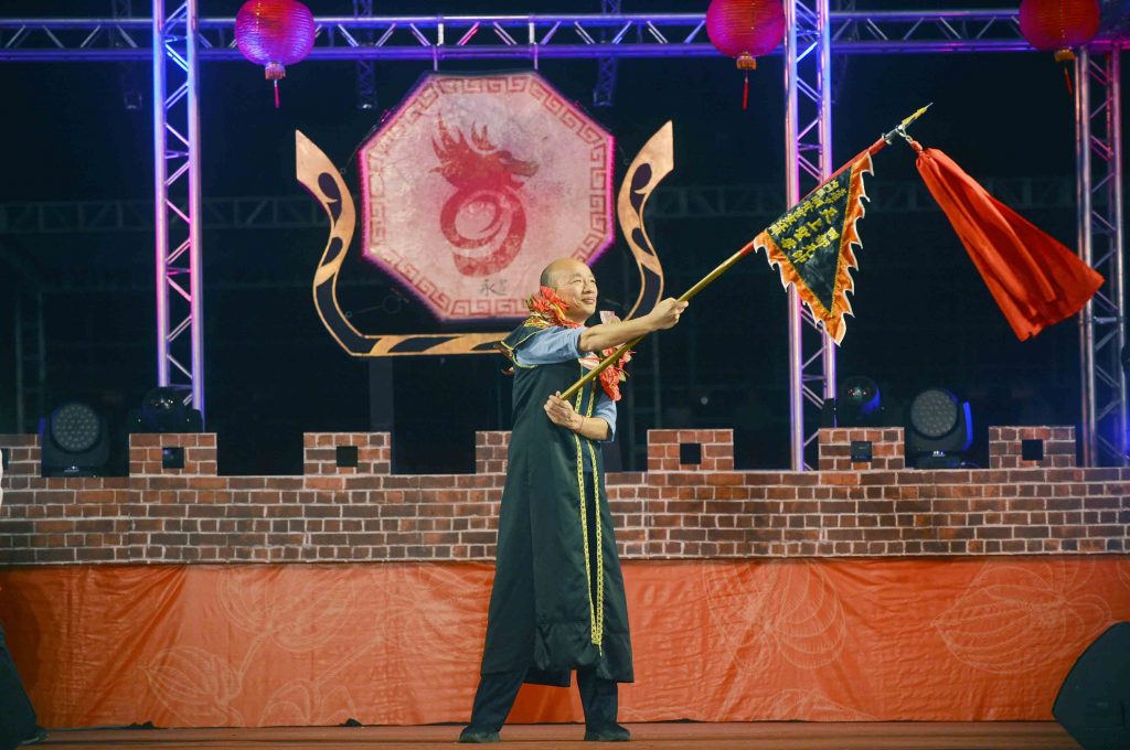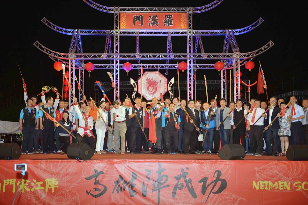 高雄陣成功!「2019高雄內門宋江陣」霸氣登場,北中南陣頭會集高雄內門順賢宮,市長韓國瑜今(30)晚擔任藝陣總指揮,揮舞旗幟並敲鑼宣示活動揭開序幕,同時也為參賽的陣頭加油打氣,祝福演出成功順利圓滿;他表示,宋江陣結合了武術、舞蹈、創意以及保鄉衛祖的精神,感謝內門所有的熱心人士出錢出力保存文化傳統,承諾市府一定做內門的後盾,大力推廣宋江陣文化。