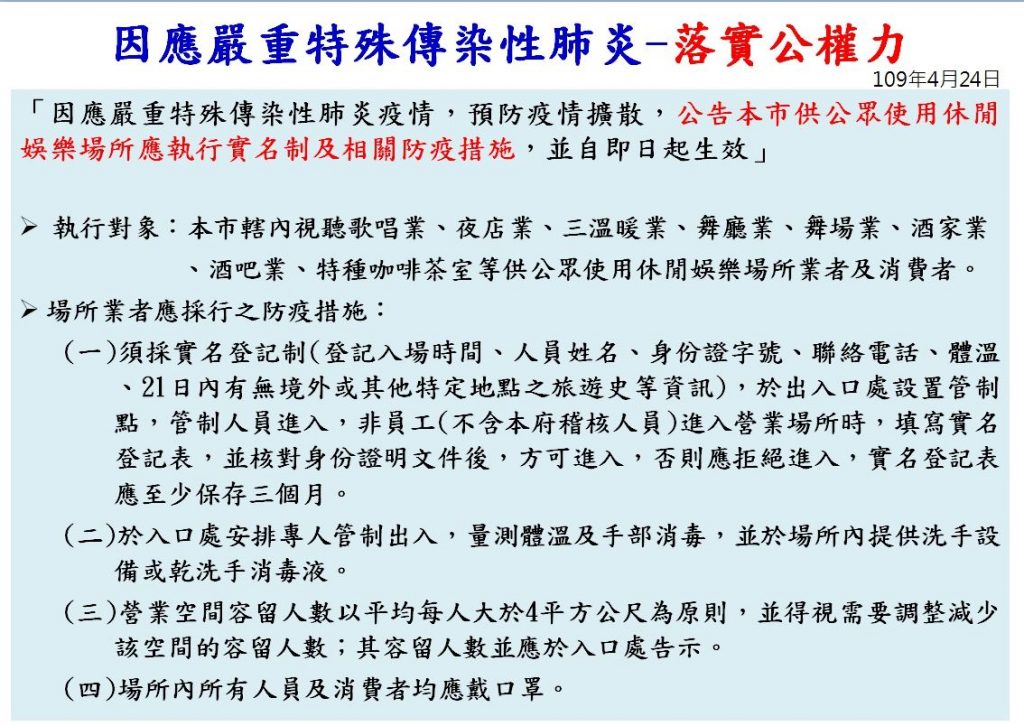 韓國瑜表示,為因應後續疫情,公布「本市公眾使用休閒娛樂場所應執行實名制及相關防疫措施」,本府經發局、警察局、衛生局將組成聯合輔導稽查小組,輔導業者執行,場所業者應採行下列四點防疫措施,包括:(一)入內活動採實名制,進入營業場所應填寫實名登記表,否則應拒絕進入;(二)入口處安排專人管制,量測體溫及手部消毒;(三) 營業空間容留人數以平均每人四平方公尺為原則,並得視需要調整減少空間容留人數;(四)場所內所有消費者均應戴口罩。
