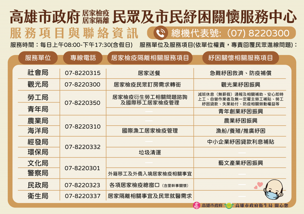 他並表示,疫情進入後流行期,有更多百廢待舉的各行各業,還有民眾需要政府關懷跟協助,因此成立該中心,總機代表號是(07)822-0300,除原衛生局等8個局處外,也結合青年局、農業局、經發局及文化局,在紓困關懷及振興等方面,提供民眾直接服務,也盼促經濟早日復甦。