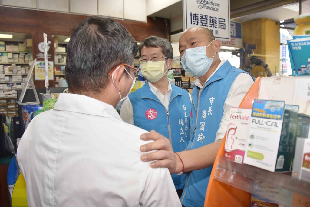 韓國瑜接續在衛生局長林立人的陪同下,前往「健生大藥局」為執業的藥師工作人員加油打氣,感謝藥局這段時間響應政府政策,協助販售口罩等防疫物品,並積極提供相關諮詢協助,積極守護社區鄰里的健康,韓國瑜同樣親自致贈感謝狀表示感謝與肯定。