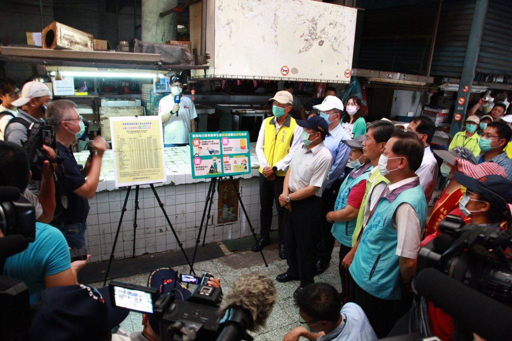 最後,楊明州巡查小港第一民有市場,過程中他親自帶上手套,以漂白水、清水一比一百的比例示範清潔、消毒攤台區域。此外,現場也於水溝進行高溫、高壓溝壁蟲卵沖刷作業,以物理性防治的創新措施代替噴藥,避免長期噴藥而產生抗藥性,減少登革熱發生機率。