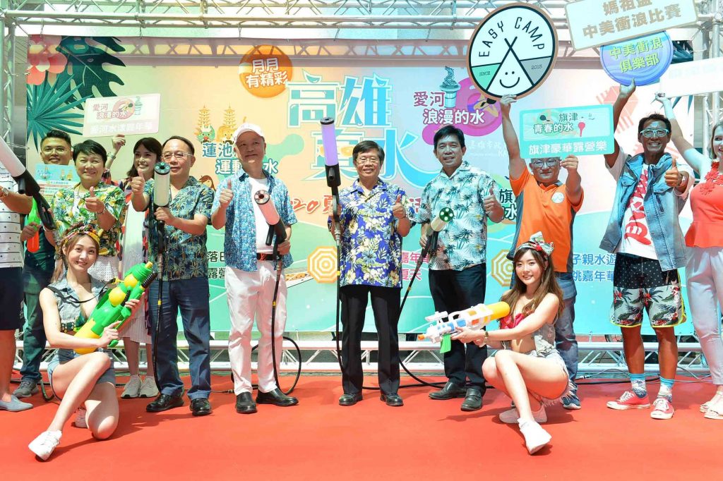 高雄真水真好玩!高雄市政府推出「高雄真水2020夏季系列活動」,代理市長楊明州今(13)日身穿花襯衫應景出席開幕儀式,並與觀光局代理局長邱俊龍等與會嘉賓倒數3、2、1,共同對空噴灑乾冰,宣布夏季戲水趴開跑,現場洋溢熱情活潑氛圍,一片歡樂。