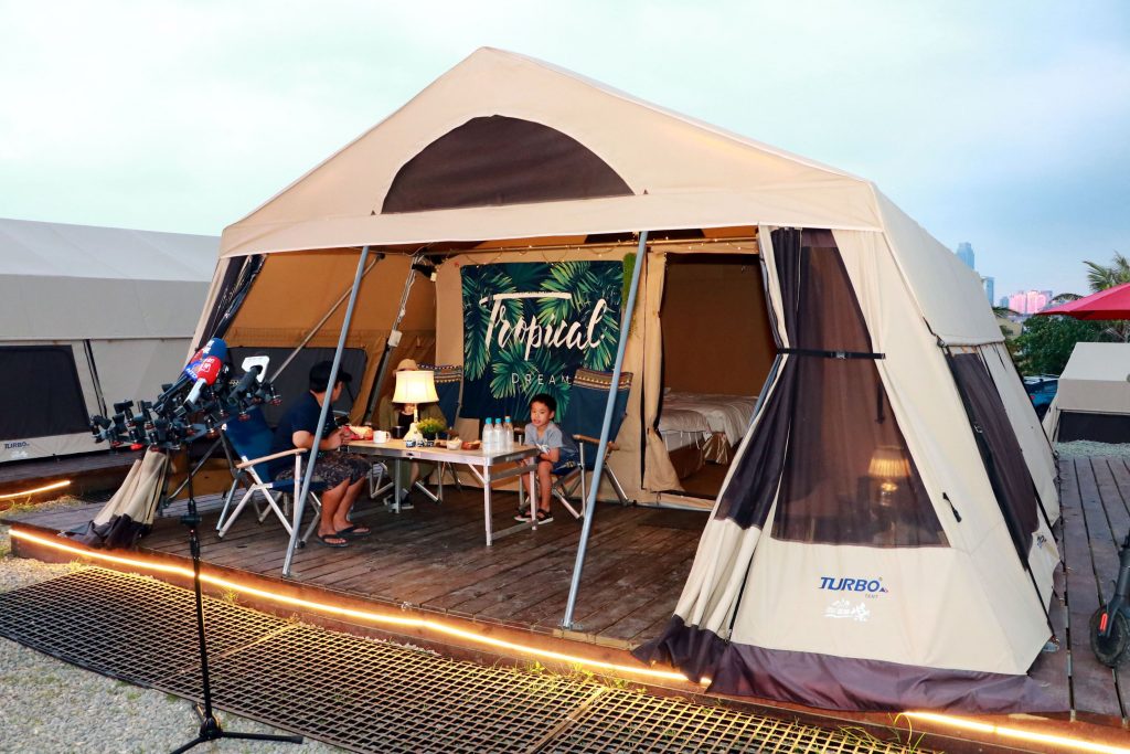 高雄旗津豪華露營區於10月1日中秋節正式開幕,觀光局表示,自8月15日試營運以來,已吸引超過5000人入住體驗。旗津豪華露營區最大特色在於免露營裝備即可入住,且帳棚內有冷氣消暑、烹飪設施以及交誼廳等設備,加上露營區特有的地理位置,可吹海風、觀夕陽、看星空,亦可賞飛機商船等多重享受,有別於其他露營區。