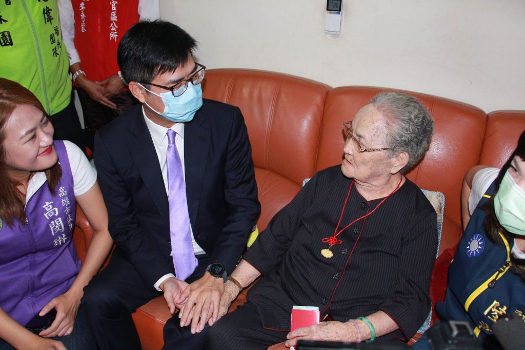 重陽節將至,高雄市長陳其邁今(20)日探視梓官人瑞曾黃也及楠梓人瑞林蔡好,關心兩位阿嬤健康狀況及生活起居,並致贈敬老狀、金鎖片、重陽禮金及水果禮盒,兩位奶奶平日熱愛歌唱,現場也唱起拿手歌,讓陳其邁市長不禁豎起大拇指,直誇兩位是人瑞界的第一名、市長獎。