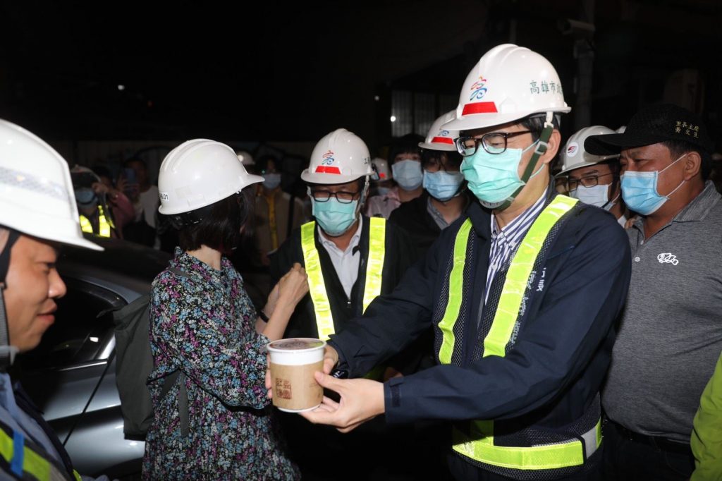 現場動工典禮開始前,陳其邁即先行到場發送湯圓,逐一為辛苦的工作同仁加油打氣,感謝他們利用假期時間犧牲假期來全力趕進度,希望大家在未來的9天堅守崗位,如期順利完成高架拆除作業。