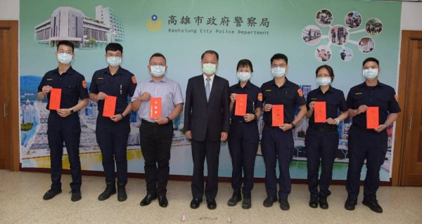 圖:黃明昭局長表揚好人好事事蹟員警,獲獎人為左營分局博愛四路派出所警員李俊明、仁武分局澄觀派出所警員黃閔歆、少年隊警員黃詩涵及頒發予三位退休人員紀念品,表彰市警局行政科科長張國讚、防治科科長翁榮華、民管中心主任潘誠章等三人。