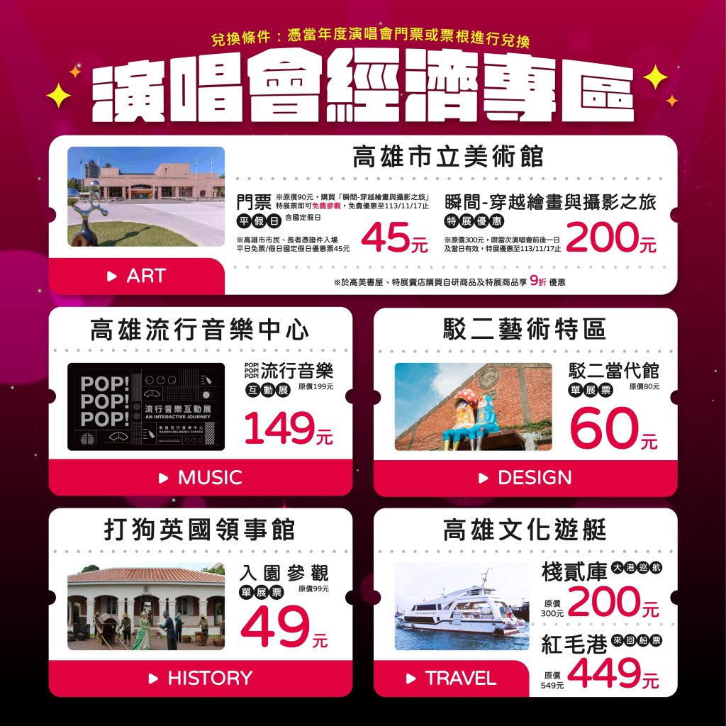 文化局長王文翠表示,為迎接即將到來的演唱會,文化局推出一系列熱門藝文場館串聯演唱會的超值優惠。凡持演唱會門票的歌迷們可以超優惠折扣價格參觀市立美術館的「瞬間-穿越繪畫與攝影之旅」特展(泰德展)、打狗英國領事館、高雄流行音樂中心的常設展、以及駁二藝術特區的駁二當代館等高雄地標性文化場館。