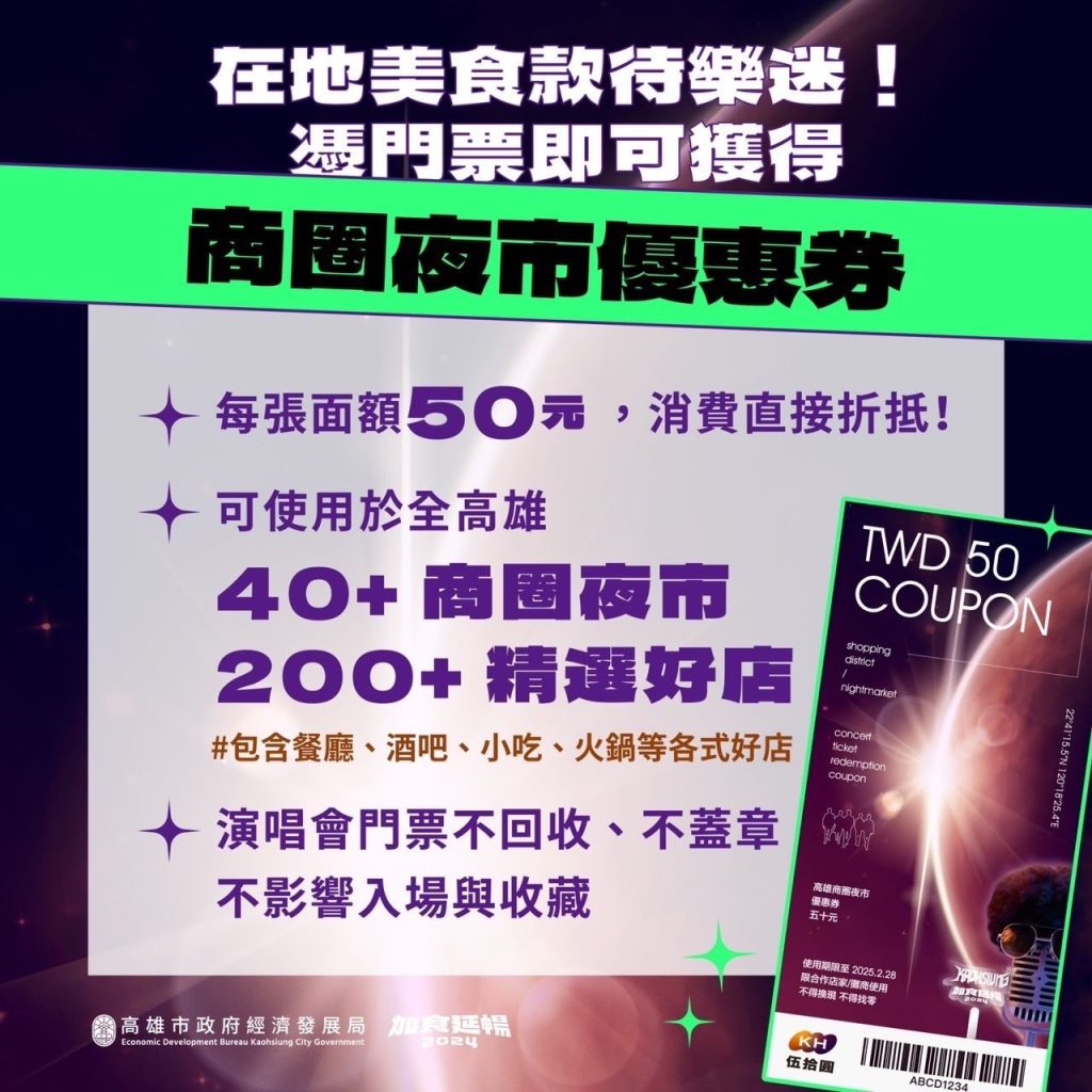 經發局強調,商圈夜市優惠券使用期限等相關優惠資訊,請大家趕快上高雄旅遊網-演唱會經濟專區(官網 https://khh.travel/zh-tw/event/news/6021 )及商圈夜市優惠券網站(官網 https://www.khafterparty.club/ )了解活動訊息。