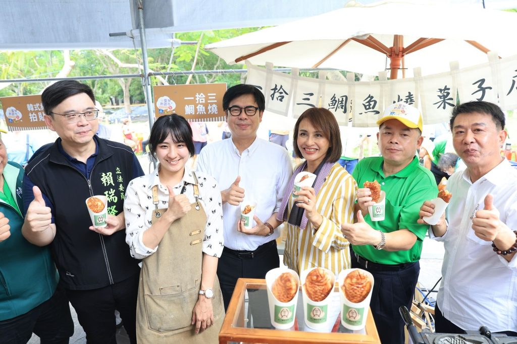 隨後,陳其邁走訪蜂農攤位,受到民眾熱情簇擁,他也駐足品嘗龍眼蜂蜜口味冰淇淋、龍眼蜜卡士達鯛魚燒,讚賞攤商創意無限,讓優質蜂蜜結合不同商品,帶來甜蜜新滋味。